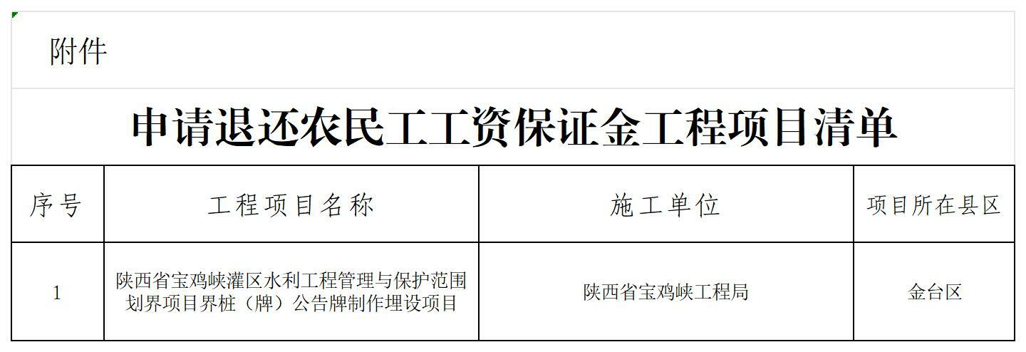根据《关于印发<陕西省建设领域农民工工资保证金规定实施办法>的通知》(陕人社发〔2022〕6号)的相关规定,现对以下工程项目(见附件)申请退还农民工工资保证金情况进行公示。公示期为30天,如发现该项目有拖欠农民工工资行为的,请自公示之日起向宝鸡市人力资源和社会保障局进行举报或投诉。公示期间未收到举报或投诉的,将依规办理农民工工资保证金返还(销户)。
