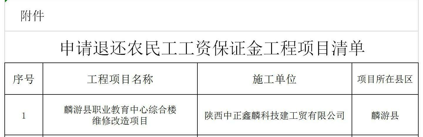 根据《关于印发<陕西省建设领域农民工工资保证金规定实施办法>的通知》(陕人社发〔2022〕6号)的相关规定,现对以下工程项目(见附件)申请退还农民工工资保证金情况进行公示。公示期为30天,如发现该项目有拖欠农民工工资行为的,请自公示之日起向宝鸡市人力资源和社会保障局进行举报或投诉。公示期间未收到举报或投诉的,将依规办理农民工工资保证金返还(销户)。