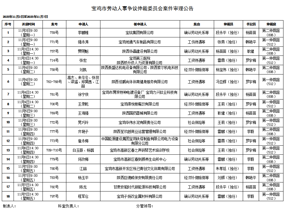 宝鸡市劳动人事争议仲裁委员会案件审理公告(2025年11月3日至2025年11月7日)