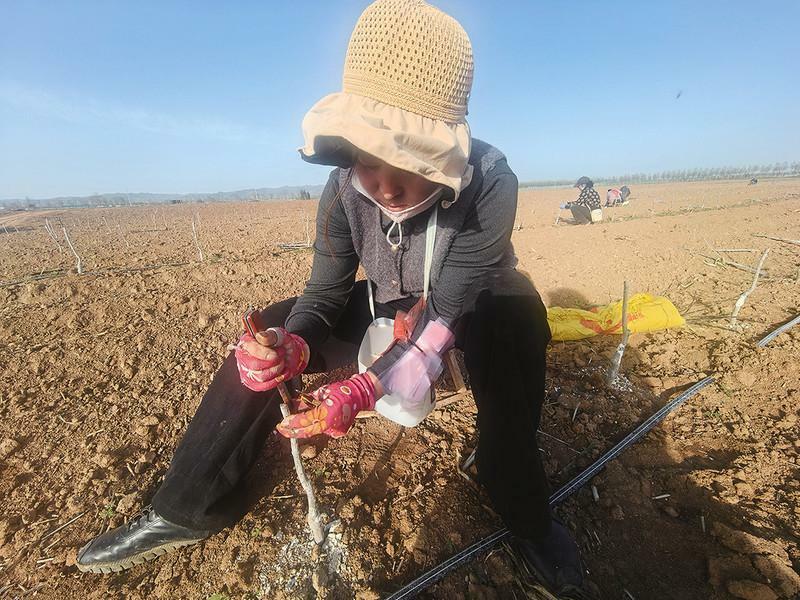 四月十二日,千阳县南寨镇三合村村民赵红艳在给苹果苗进行高接换头。